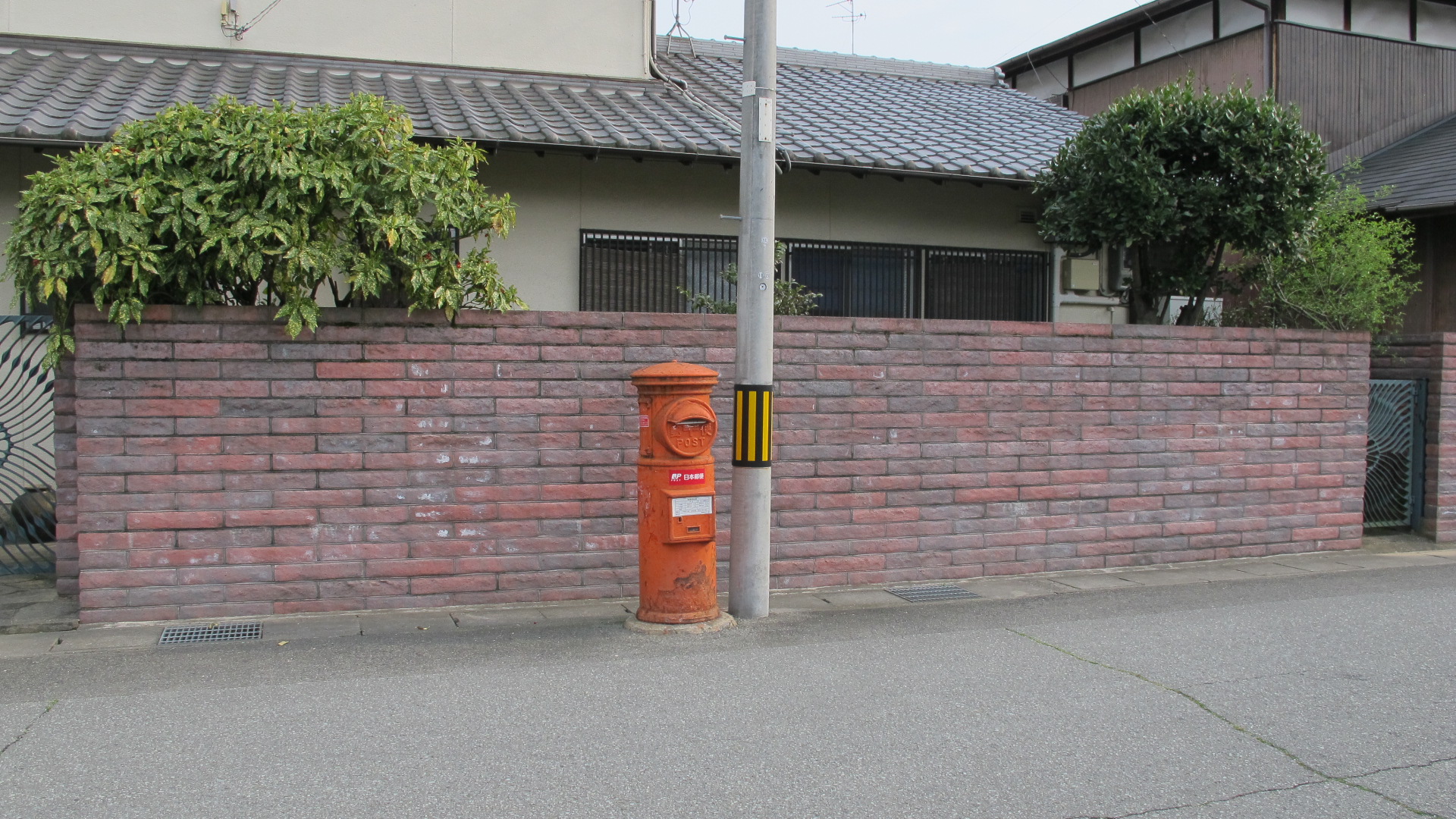 赤茶色のブロック塀の近くに設置されている丸型ポストの拡大画像 (JPEG: 848.1KB)