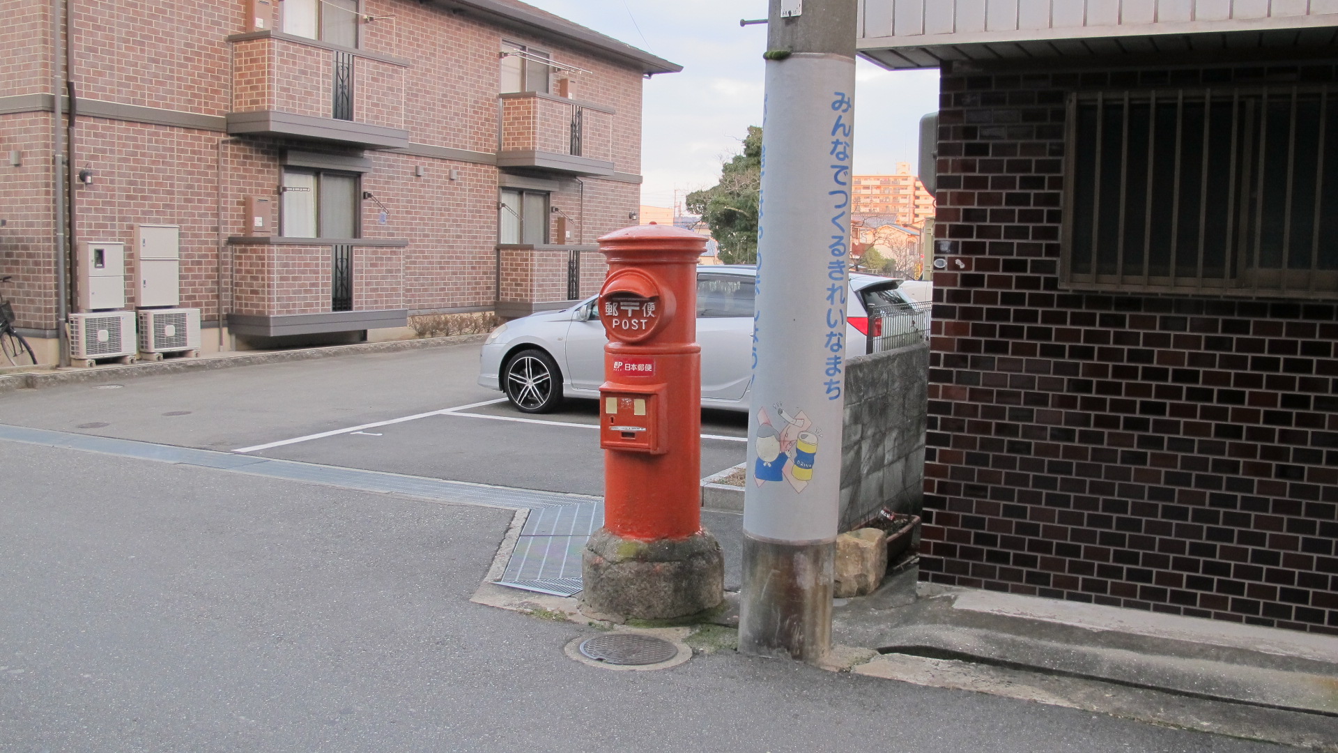 駐車場と電柱のすぐ傍に設置されている丸型ポストの拡大画像 (JPEG: 690.8KB)