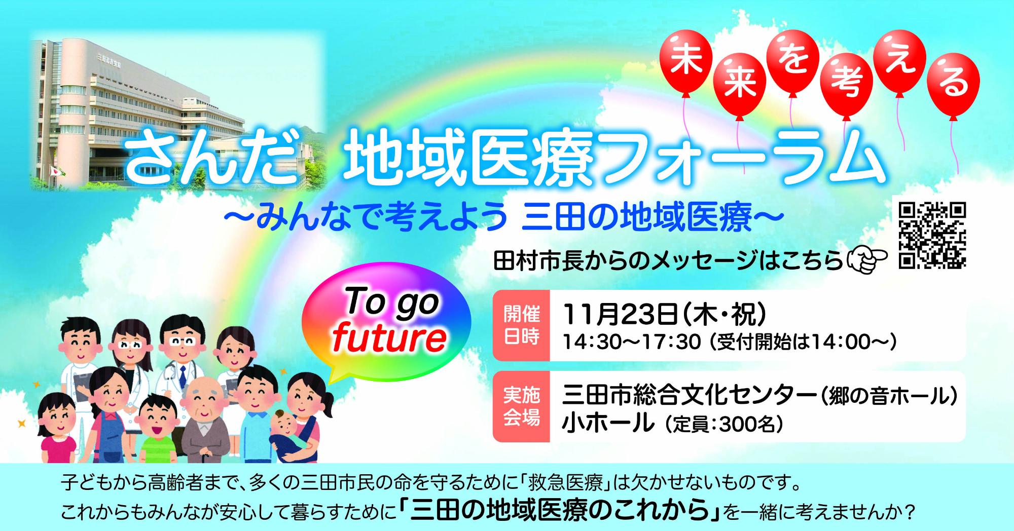 三田市の地域医療を将来にわたって守り続けるため、医療有識者の方々をお招きし、市民の皆さまと一緒に地域医療の未来について考える場として、さんだ地域医療フォーラムを開催します。