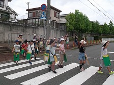 横断歩道は手を挙げて。交通ルールを守って歩くことも、今回の大事な学習の一つです。